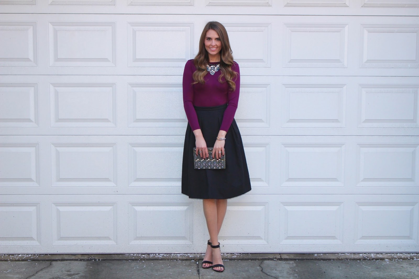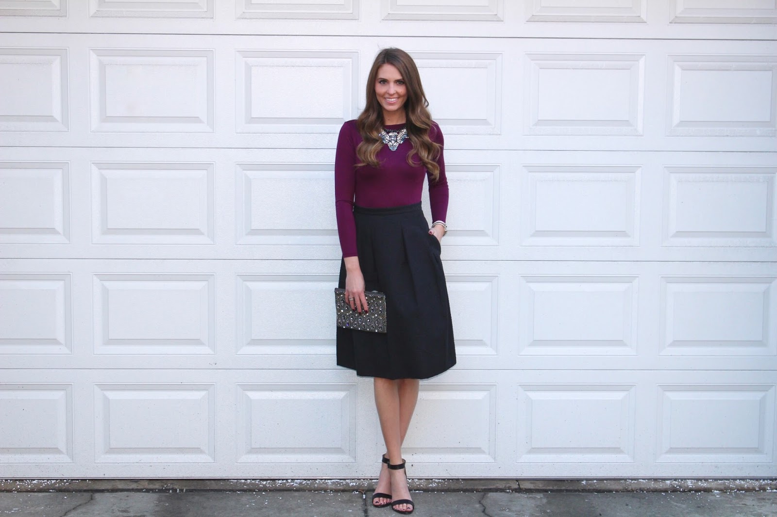 I started with this adorable bubble skirt that I bought at H&M a couple of years ago. Since the skirt is full and more of a statement, I just added a very simple long sleeve shirt. To complete the look, I added a statement necklace, a strappy heel and a beaded clutch.