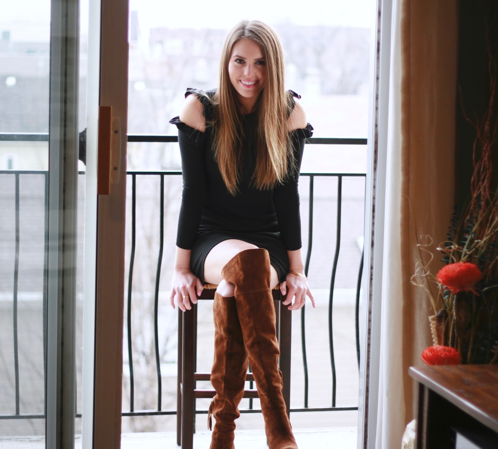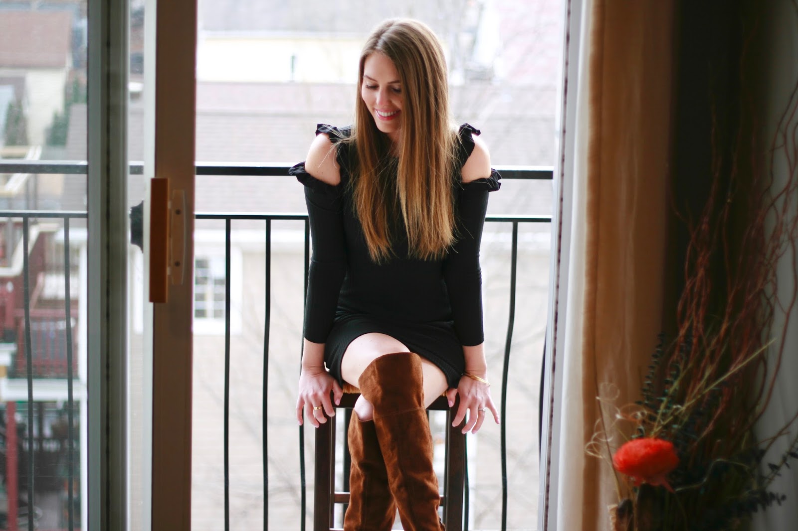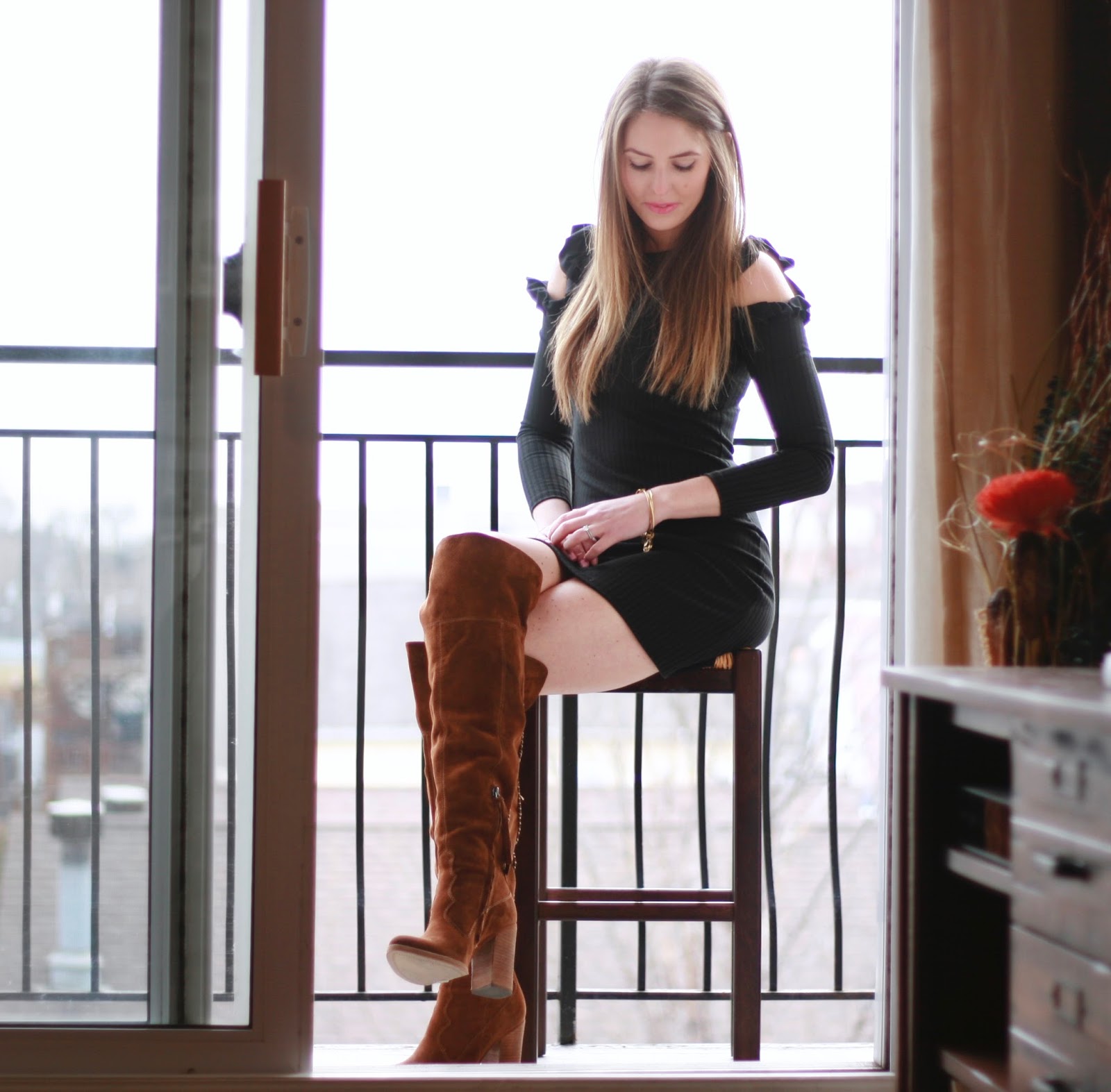 Long sleeve cold shoulder a-line dress // Dolce Vita Cliff over the knee boots //