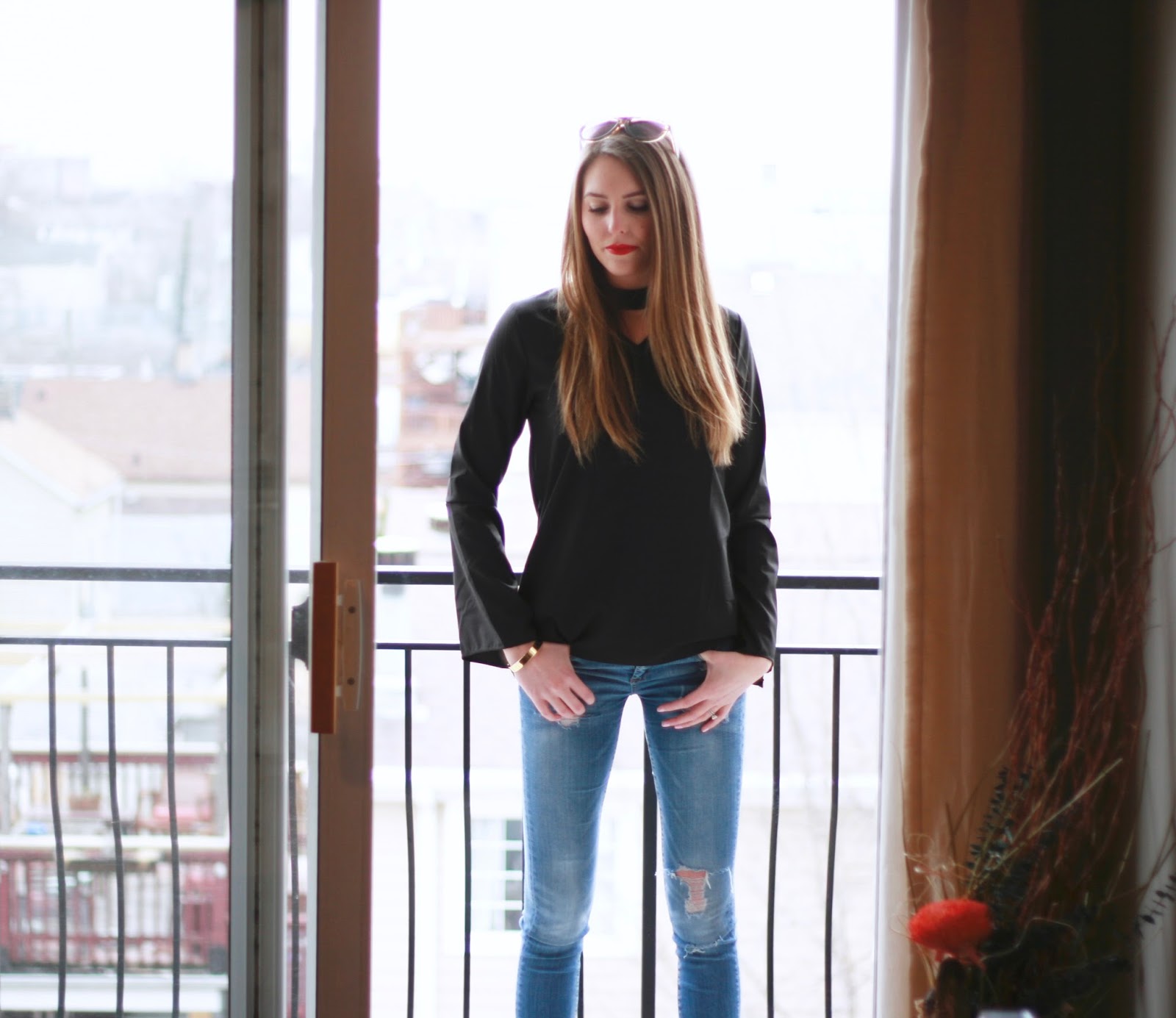Black loose choker flare sleeve blouse // Leopard pattern sunglasses // Similar Blank NYC jeans //