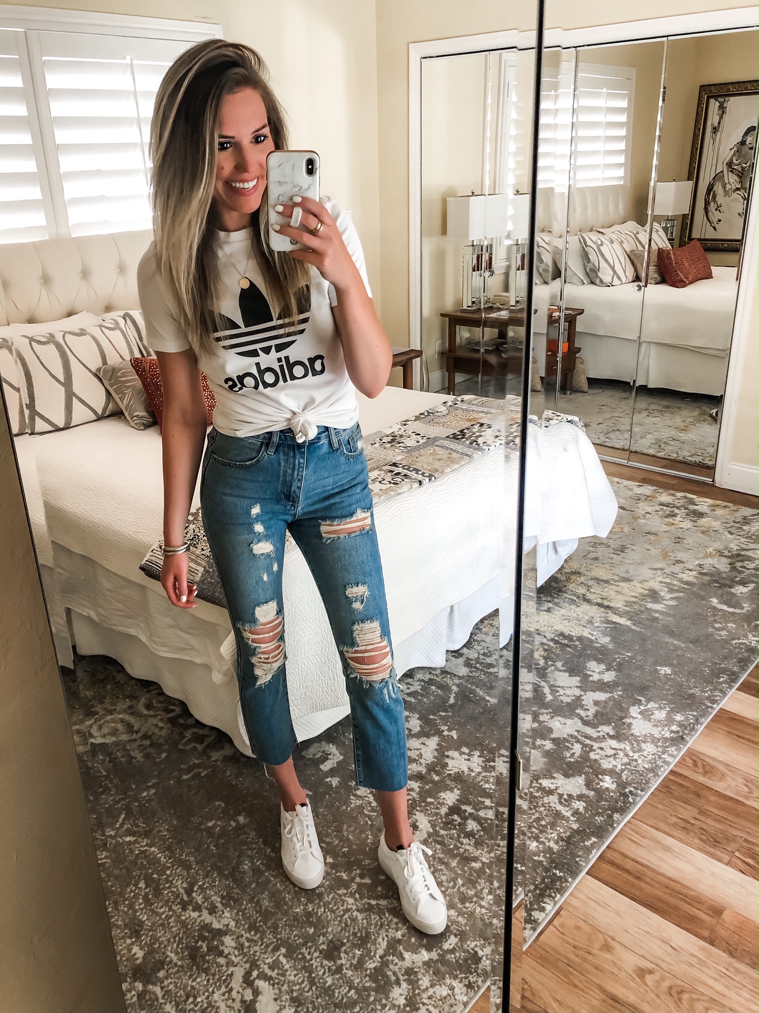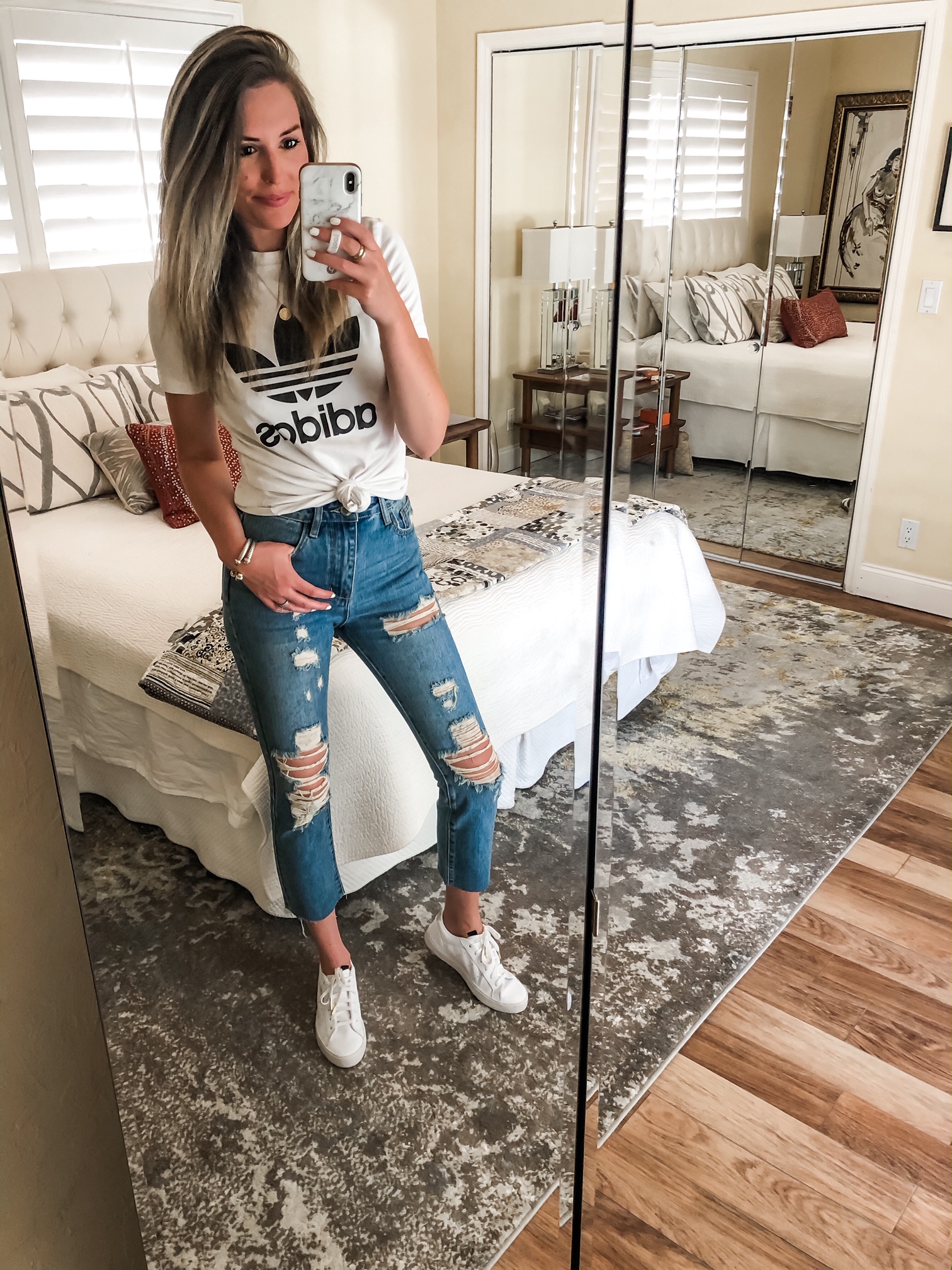 The last look from my BuddyLove try on is this super cute and casual outfit. This one is also very me – I’m a total jeans and a tee kind of girl. I added my own Adidas trefoil tee and Adidas sleek sneakers, but these distressed jeans are from BuddyLove. These ones are high rise (always a plus) and run a tiny bit small. They are a little tight in the thighs, but not too tight that I couldn’t get them on and button them up. However, for comfort purposes, I would size up. Shop my look below: