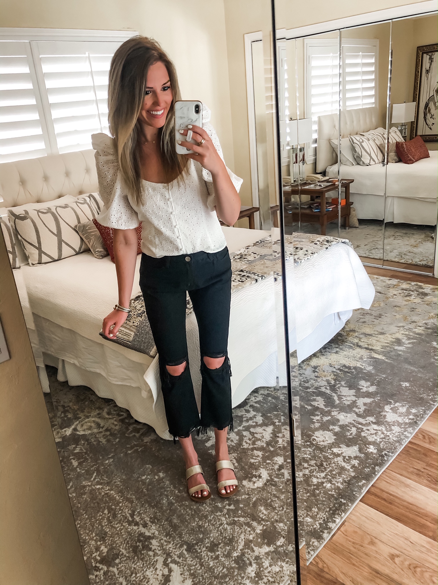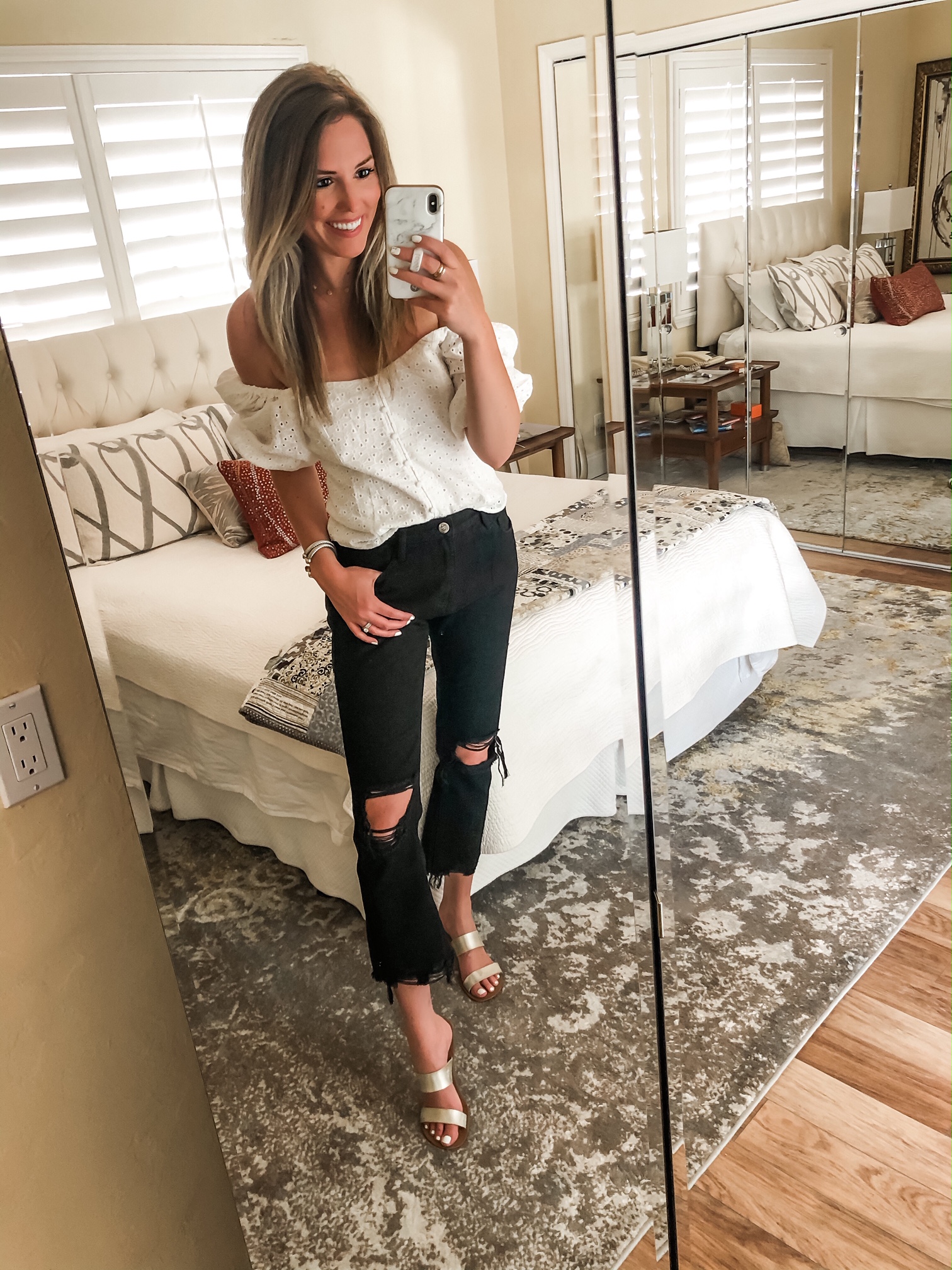 This outfit is so me, I love everything about it! The eyelet top with the sweetheart cut is just so good! You can wear it off the shoulder or on, like you see above. When on the shoulder, it has the cutest puff sleeve detail – which is super on trend right now!